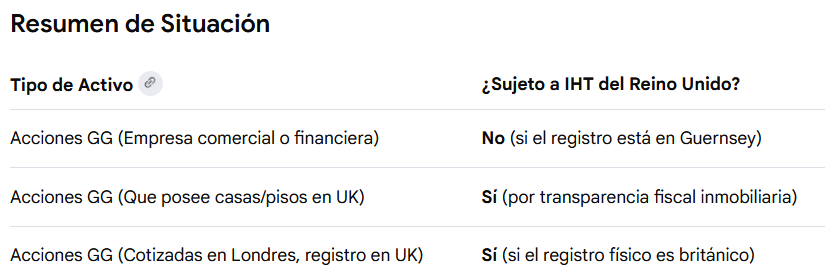 Le he preguntado a Gemini si acciones de empresas domiciliadas en Guernsey, Jersey e Isla de Man se ven sometidas al mismo régimen del IHT y la respuesta ha venido a ser “no, pero sí”, porque estoy pensando en alguna empresa que cotiza en Londres.