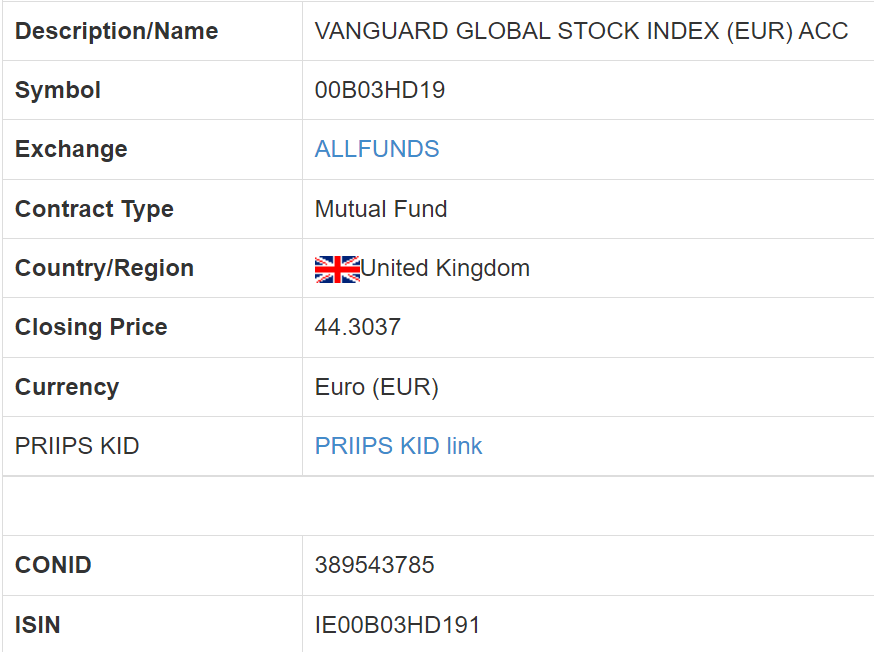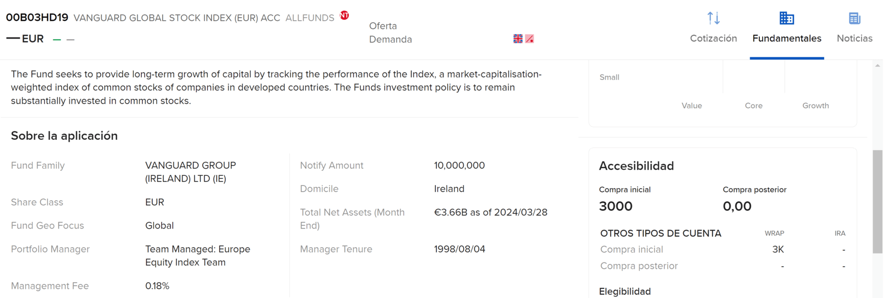 Por ejemplo, buscas el Vanguard LifeStrategy 80, y en lugar de salirte un montón de opciones (como en Degiro) con los mercados visualmente claros, te salen sólo dos. El primero es el mercado italiano, que no me fío mucho de su liquidez, sinceramente… Pero es que ni siquiera encuentro dónde consta el volumen para compararlo con el otro resultado.