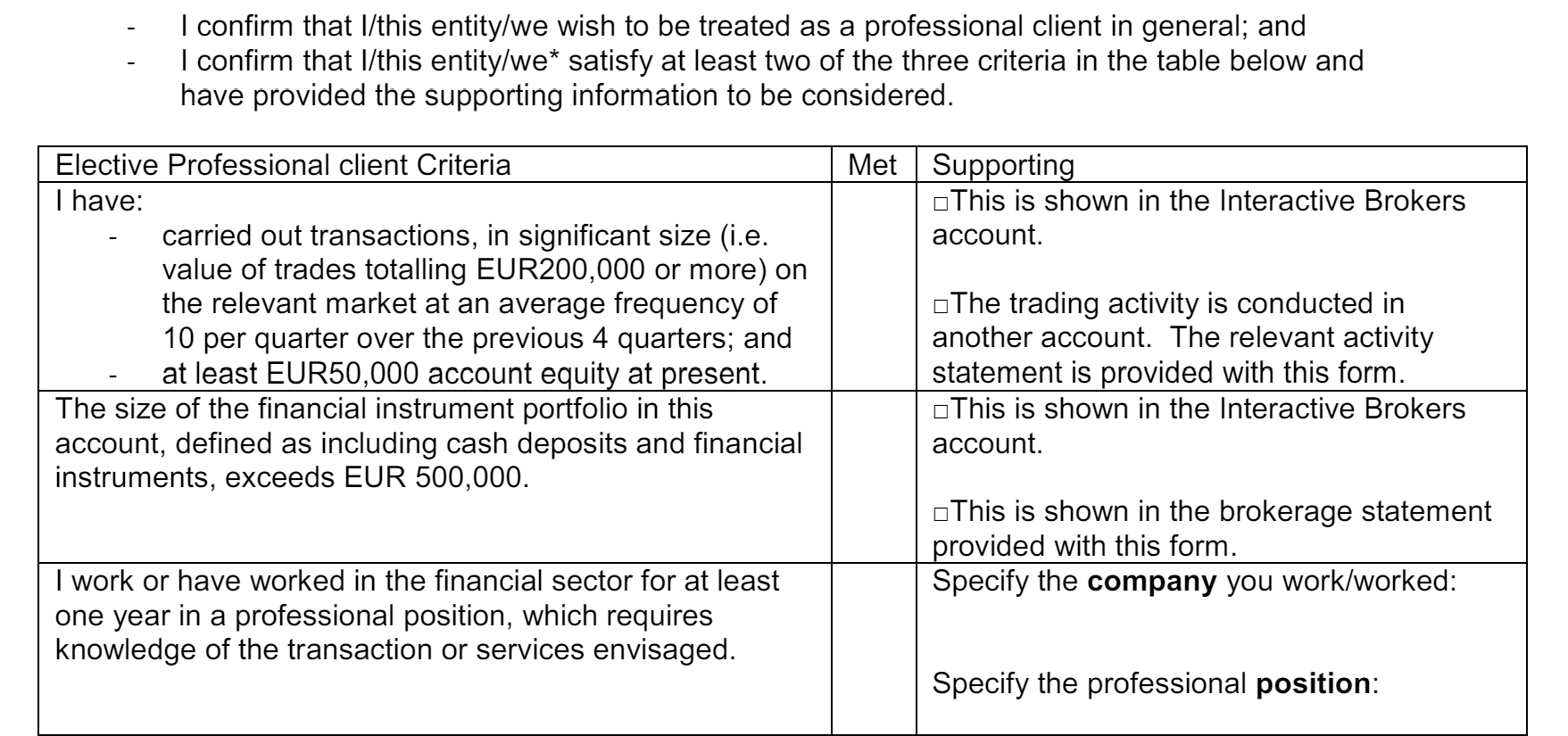 Repite la solicitud otro día indicando que dispones de mas de 500K en otras cuentas. Creo que a la tercera te habilitan como profesional.