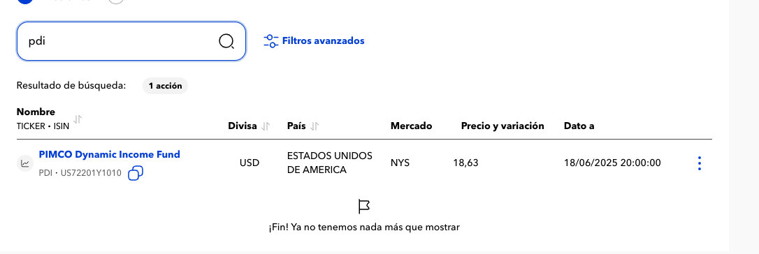 Hoy quería comprar PDI (Pimco Dynamic Income Fund) y no hay Opciones, por lo tanto no puedo aplicar ese truco. ¿En qué broker lo compráis vosotros? Yo me había hecho la cuenta de Interactive Brokers por la variedad de productos que tiene, y me está viniendo muy bien para llevar Oro y algunas opciones financieras, pero me gustaría también poder invertir en otros productos como éste y otros ETFs interesantes. ¿Sabéis la solución?