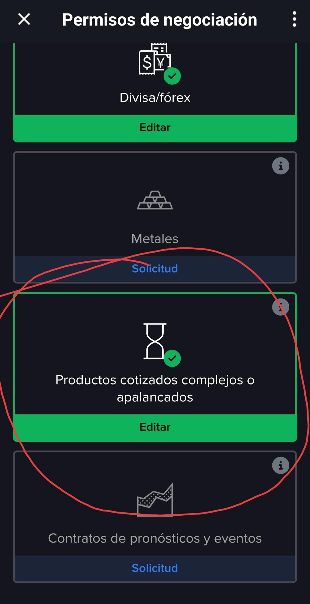 El mismo aviso de negociación te dice qué permiso necesitas (“debe solicitar permisos de negociación para productos complejos o ETF apalancados”). Yo lo he solicitado por la web pero también parece que se puede desde la app. Asegúrate de marcar este permiso y completar el proceso: