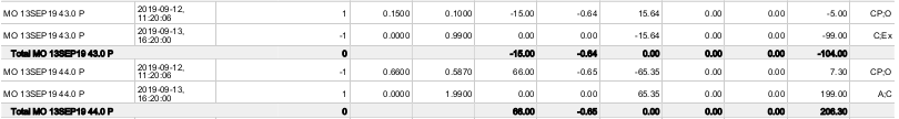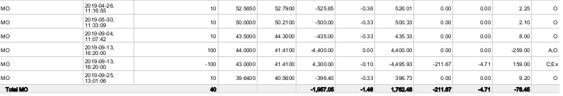 Dicho esto, tengo un problema con el extracto, y es que no le encuentro sentido alguno al resultado de una operación, haga lo que haga. El año pasado tenía compradas 30 acciones de MO (3 operaciones de 10 acciones cada una) y compré/vendí un par de puts que se me ejecutaron (bad timing, pero eso es otra historia y otra experiencia). Por lo tanto tengo tres operaciones de compra de 10 acciones anteriores, una de asignación de 100 acciones de la put vendida, y una de venta de las 100 acciones. Agradeceré a cualquiera que me pueda explicar como llega IBKR a la cifra de $211,67 en la columna de PyG.