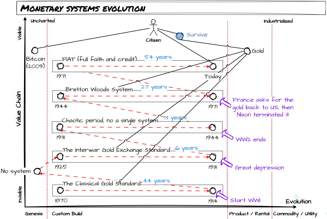 a raiz de ir mirando en la historia monetaria y entender cosas concretas me hice un mapa de como ha ido funcionando los sistemas monetarios en los últimos 250 años
