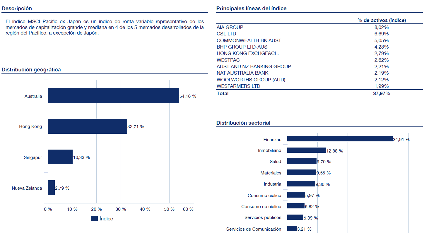 Sin meterme en los porcentajes que uno le tendría que dar en su cartera pasiva a cada fondo, de cara a cubrir los huecos de diversificación que “se deja” a un fondo indexado al MSCI WORLD, y a mayores de un fondo indice de emerging markets, ¿no sería acertado meterse un poco en uno que se indexe contra el MSCI PACIFIC FREE EX JAPAN?