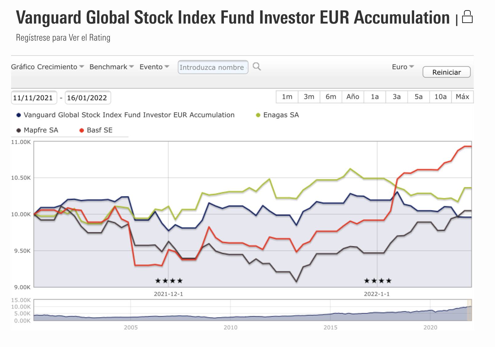 Las he comparado con el Vanguard Global Stock que es donde metí el dinero (a las acciones además habría que sumarles los dividendos pagados, que tanto Enagas como Mapfre han pagado):