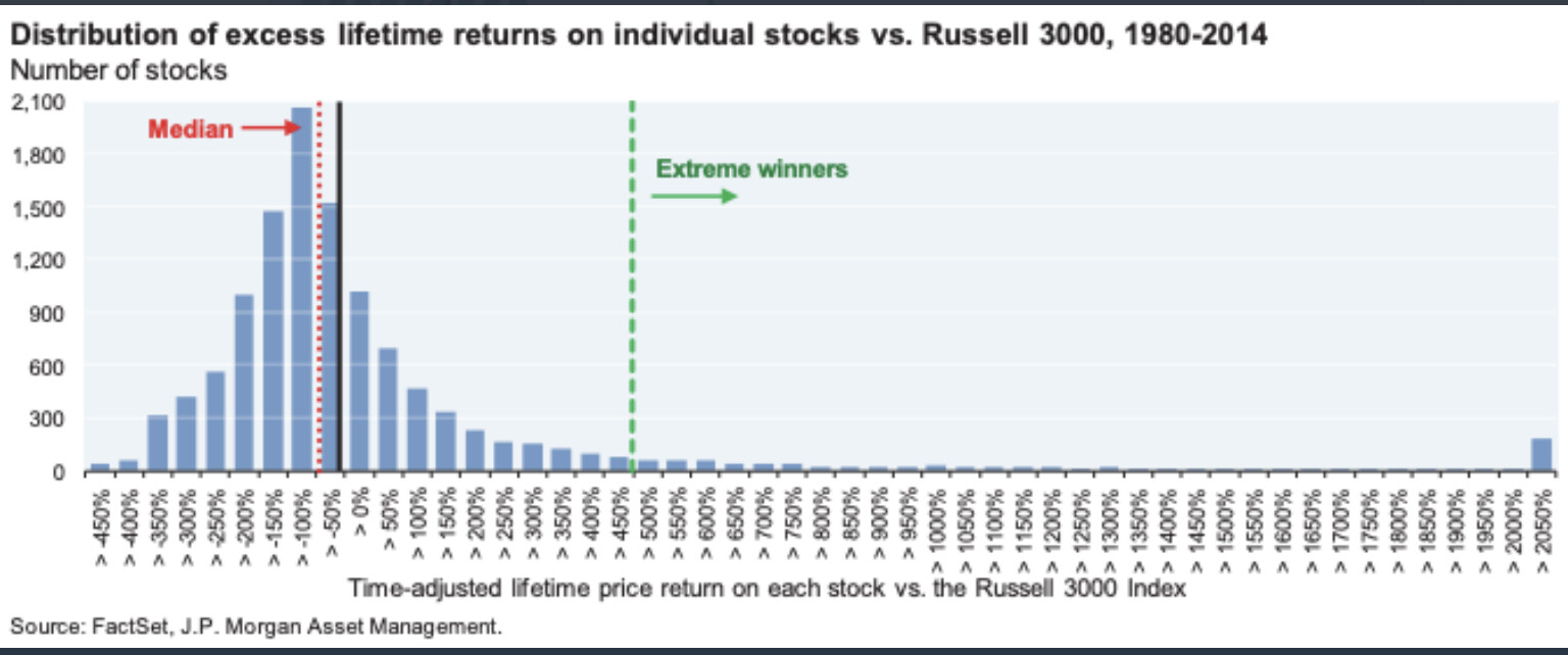 “desde 1926 sólo el 4% de las mejores compañías que han pasado por los índices contribuyen a su rentabilidad neta total . Además, 4 de cada 7 acciones dieron una rentabilidad inferior a los T-Bills (el equivalente a las Letras del Tesoro Español). Esto quiere decir que la inmensa mayoría de las acciones no producen rentabilidad neta al pasar por el índice, pero las que sí lo producen son mucho menos frecuentes y su impacto positivo es tan grande que compensa el efecto agregado de las perdedoras: