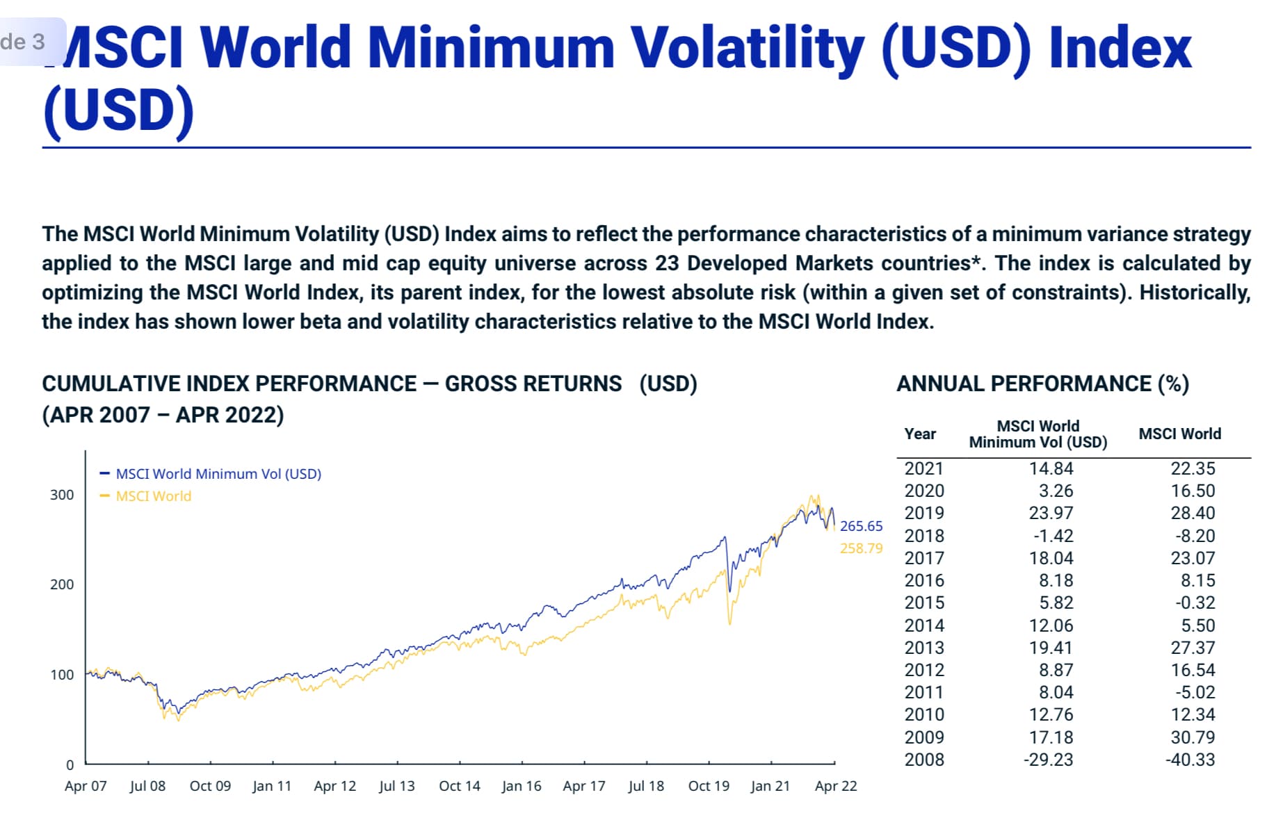 Por ejemplo, para eso que comentas de evitar volatilidad, existe el factor conocido como “mínimum volatility”. Este ha sido su comportamiento en los últimos años: