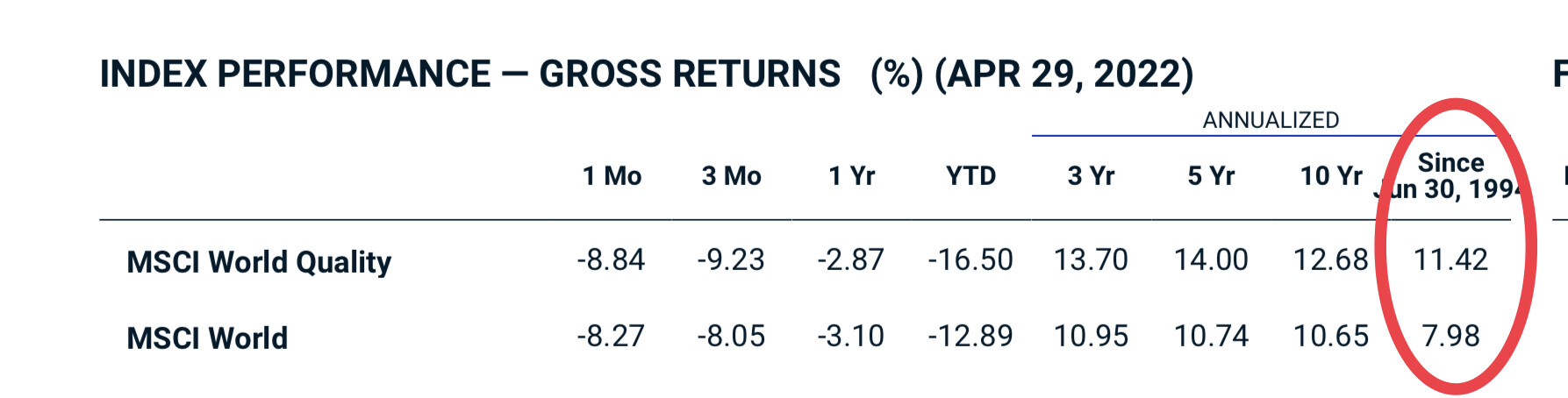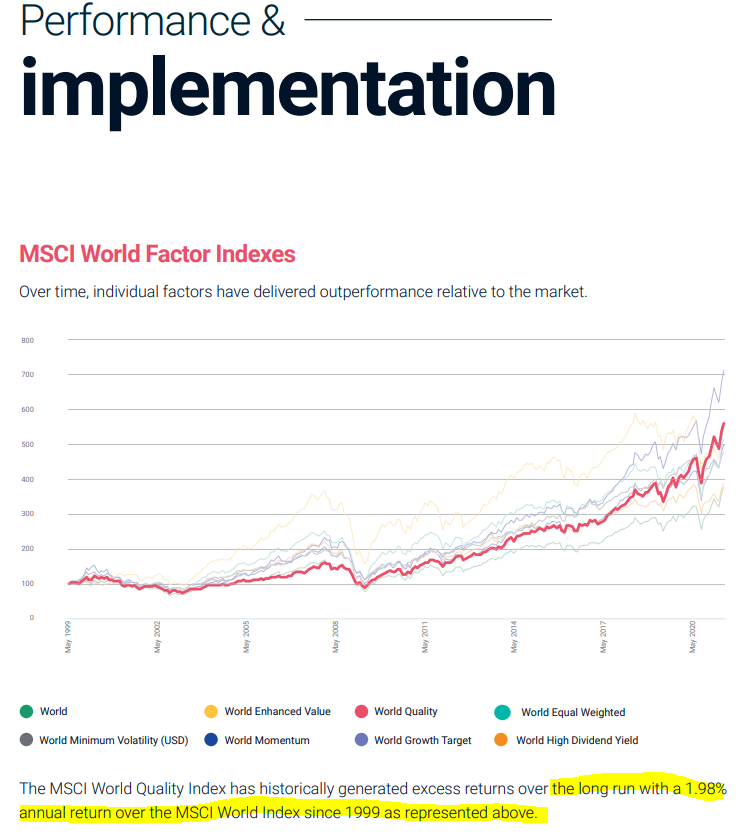 Parece que el factor Quality mejora en casi un 2% anualizado al world desde 1999. De hecho según MSCI todos los factores mejoran al MSCI World en rentabilidad en ese período