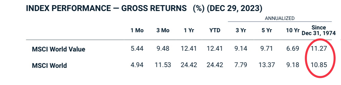 Ahora lleva unos años de moda el Quality. ¿Por qué? Porque lo ha hecho mejor que el índice. Pero no hace tanto tiempo que lo bueno era el Value. “Comprar por menos de lo que vale” se decía. Ya nadie recomienda el Value. Y sin embargo, ha superado al World desde el año 74 del siglo pasado: