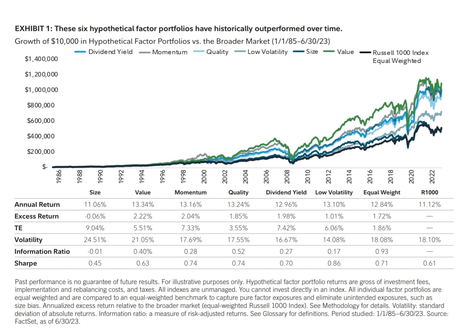Justo ayer estuve mirando un vídeo de un experto en finanzas que me gusta mucho (Ramin Nakisa de Pensioncraft) y explica muy bien este tema de los factores. Hay evidencia estadística que todos los factores tomados por separado han batido al mercado general (growth, momentum, value , size…) siendo el value el que más ha batido al mercado históricamente.