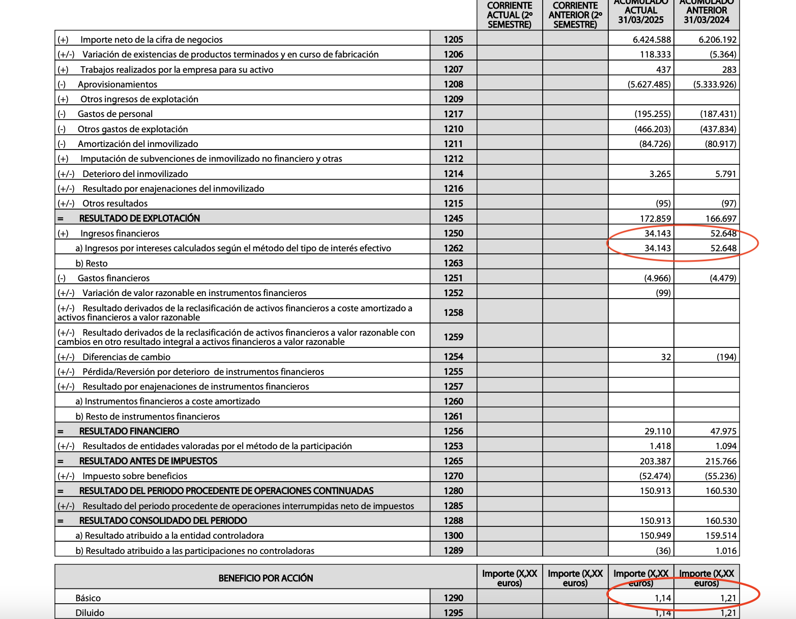 Habrá que ver cómo evoluciona el resto del año. El negocio propiamente dicho, visto por encima y sin entrar en detalle se ve que va bien, pero los ingresos financieros han caído significativamente y, aunque el resultado de explotación aumenta el beneficio neto y el BPA disminuyen un 5,75%.