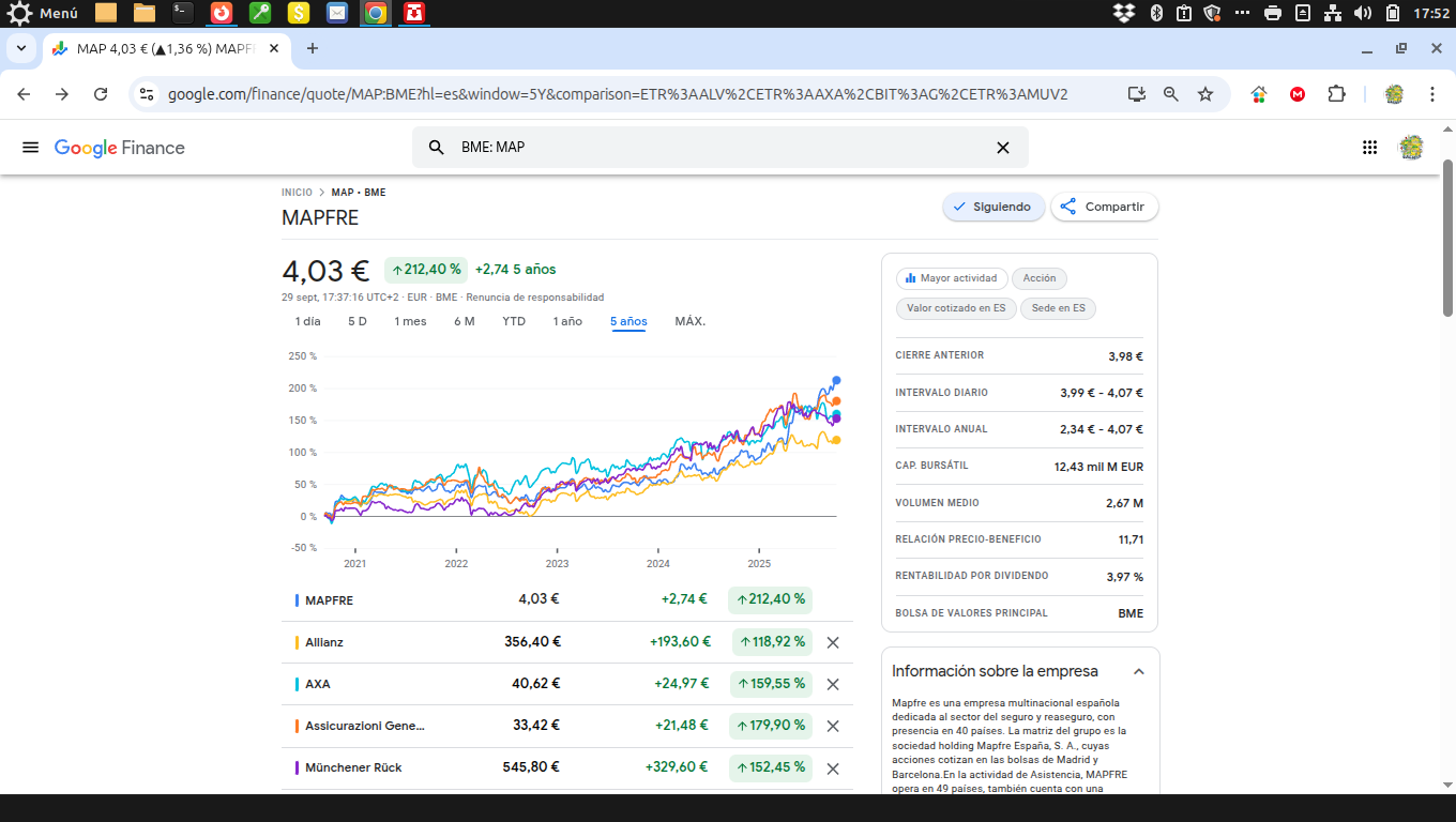 Mapfre es una vaca lechera de manual que si en algún momento te la encuentras en el suelo se le puede meter una cantidad importante. Pero que a largo plazo no debería representar una posición top en mi cartera. Le tengo cero apego pero se podría quedar ahí 10 años más sin problemas