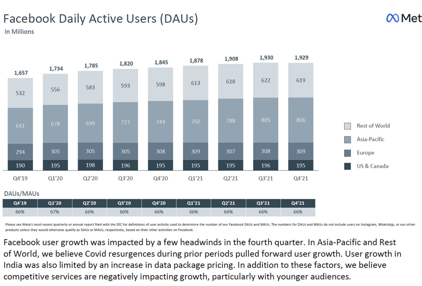 Meta Platforms, the parent of Facebook, reported mixed fourth-quarter 2021 results. Revenue was slightly ahead of expectations but the firm missed on the bottom line due to higher investments in not only the reality labs segment but also in reels and in overall improvement of its advertising back-end. The firm’s first-quarter 2022 revenue guidance was below the consensus estimates, driving the stock down 23% in after-hours trading. We have slightly lowered our revenue growth assumptions for Meta, resulting in a $400 fair value estimate, 1% lower than our previous valuation. We don’t think the market’s reaction is warranted and believe wide-moat Meta’s shares now present an attractive investment opportunity.