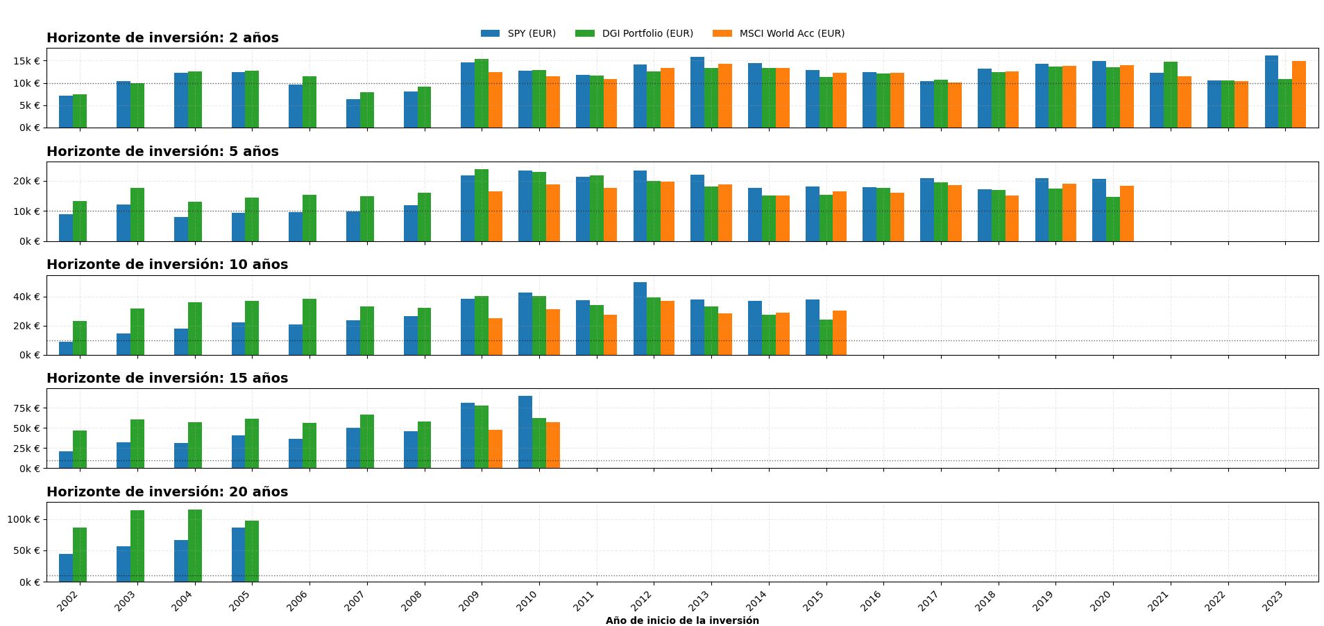 Como puedes observar a largo plazo la cartera DGI tiene un buen comportamiento, pero a partir del 2009 se nota que el crecimiento que ha tenido el SPY es mayor.