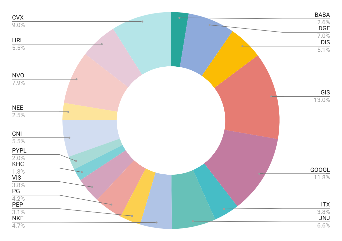 Aquí va la evolución de mi cartera DGI comparada con SPY y MSCI World. La metodología es la misma que había seguido en el gráfico anterior, pero he incluido las acciones que componen mi cartera: DGE.L, ITX.MC, PEP, DIS, GIS, GOOGL, JNJ, NKE, PG, RIO.L, VIS.MC, KHC, PYPL, OXY, CNI, NEE, NVO y HRL. También tengo que mencionar que, si en el incio del año en el que comienza el análisis, una de las acciones no está cotizando en bolsa, no se considera.
