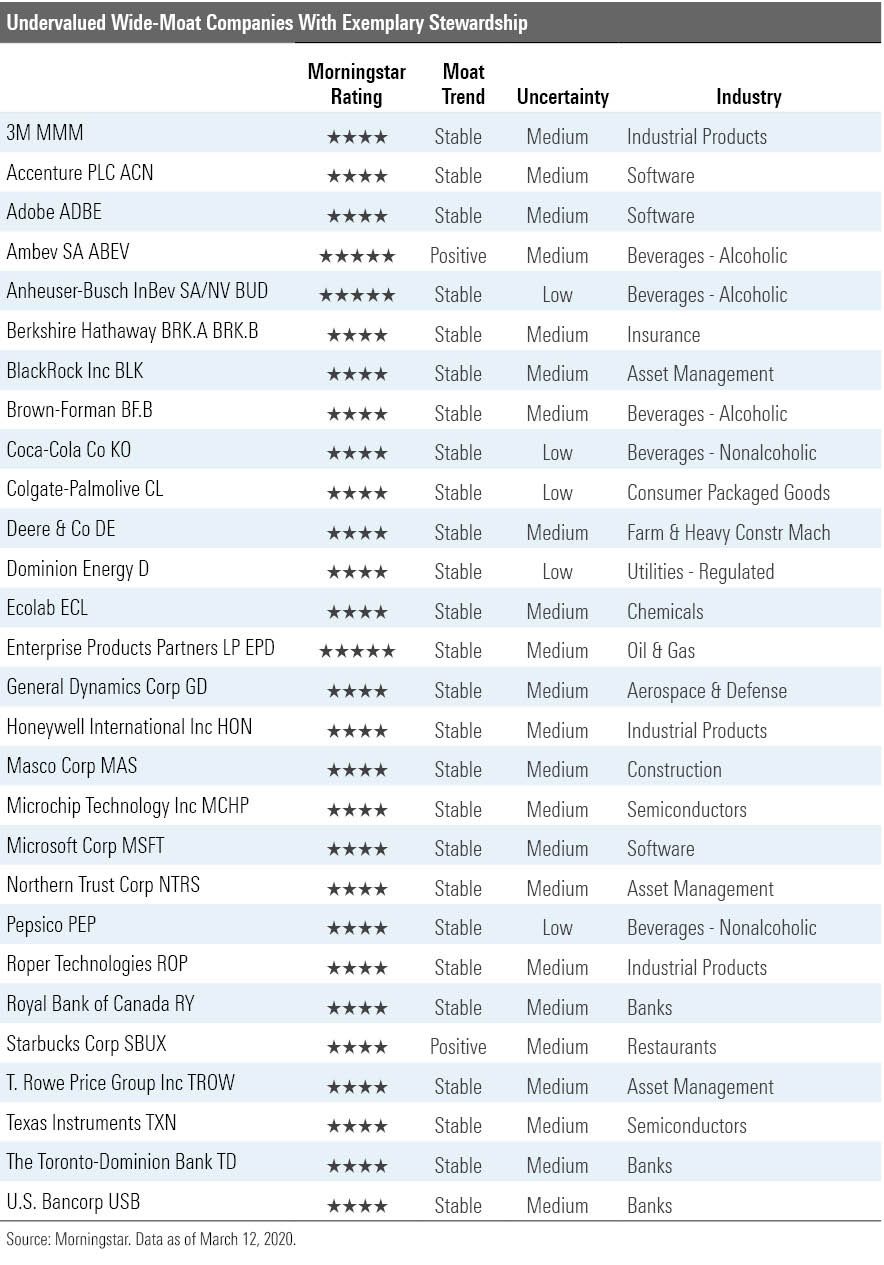Given the ongoing market unrest, we wanted to focus on exceptional teams leading high-quality, undervalued companies. Specifically, we screened for wide- and narrow-moat stocks with Exemplary stewardship ratings that were trading in the 4- or 5-star range. We tossed out those stocks with fair value uncertainties of high or above.
