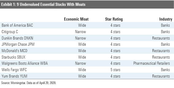 We’re sharing several undervalued stocks with Morningstar Economic Moats of wide or narrow, hailing from industries that most would agree are “essential” today: restaurants offering takeout, banks, and pharmacies. All are trading in 4- and 5-star range as of this writing, suggesting they’re undervalued. Notably, no grocery or home improvement stores look undervalued by our metrics.