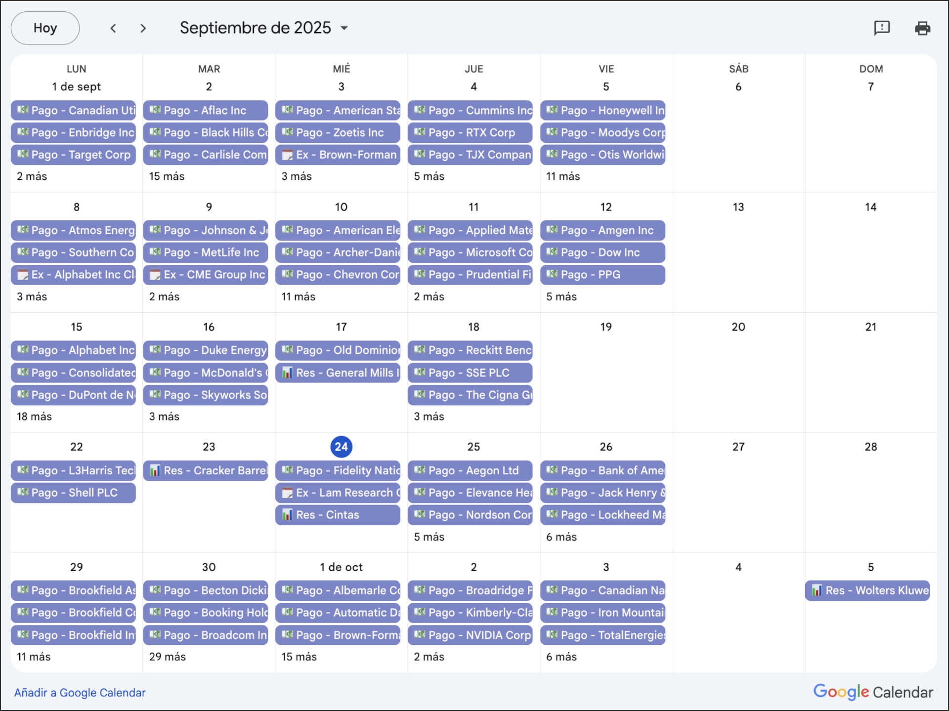 Actualización del calendario de dividendos y resultados empresariales con datos a 24/9/2025.