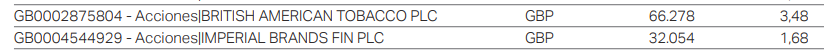 No, no, no para nada. No me atrevería. El tabaco tiene ahí su sombra, su filo delgado. Está bien pero no me atrevo a tanto. Es una más, ponderada menos que Reits que cargué el año pasado y eso tal vez tampoco esté bien. Tengo todo desbaratado para dar porcentajes, a ver si me pongo.