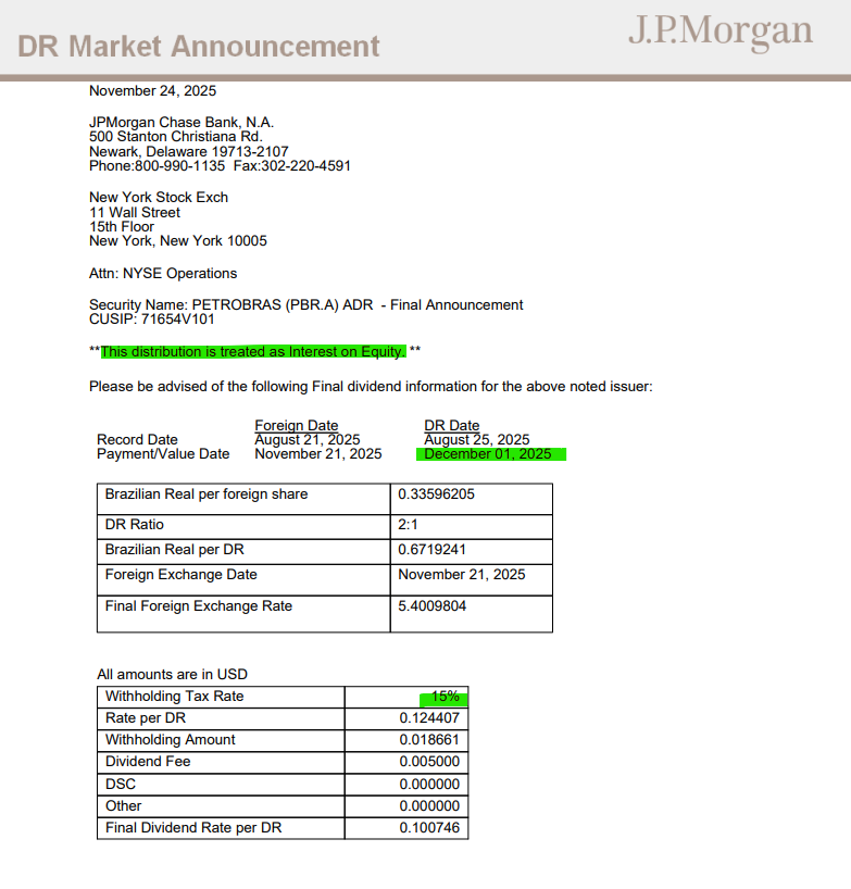 En el pago de esta fecha, tal como lo indican en el anuncio, se hacía completamenta de forma de Interest on equity