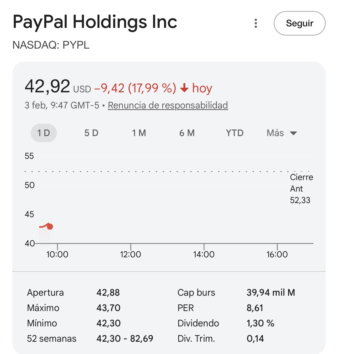 Hoy va a ser para PYPL. Viene en pre-market con un 16%, la caída es monstruosa desde máximos.
