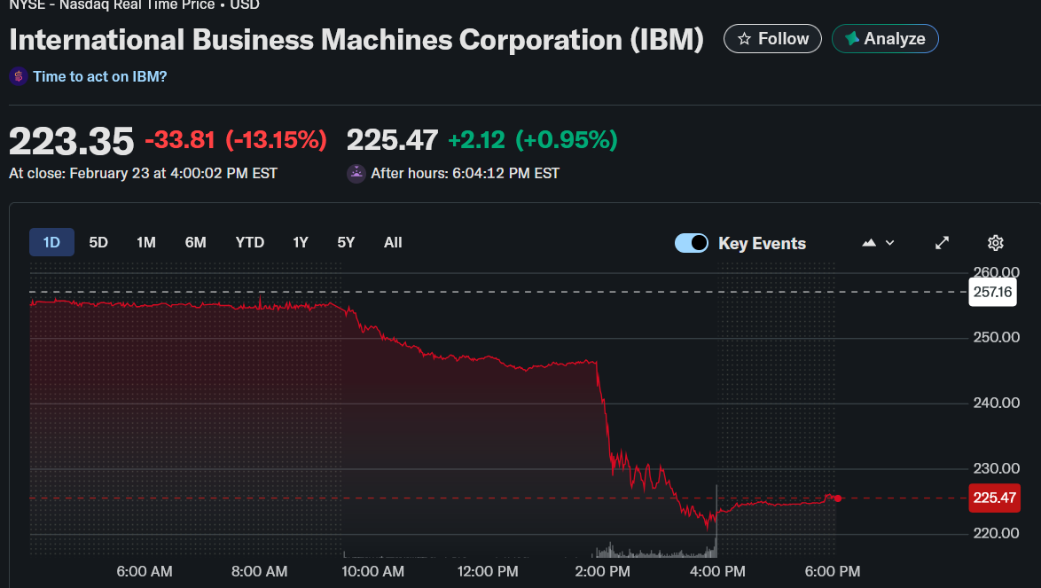 Otra que se ha metido una buena leche hoy. Lleva casi -25% en 2026 y desde primeros de febrero ha perdido unos 90 dolares. Algo sobre Antrhopic y Cobol?