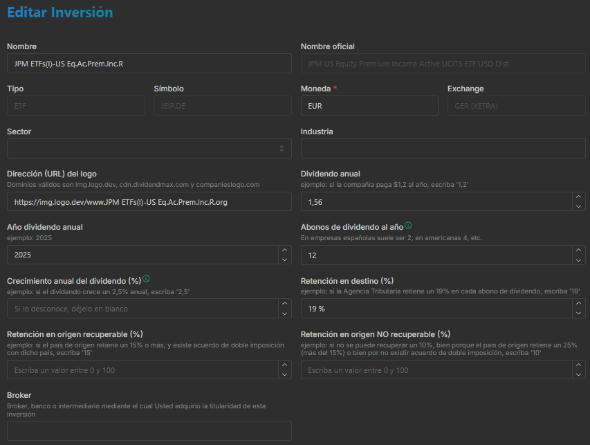 Tengo una duda y es que no consigo que aparezcan los dividendos estimados para el futuro. Por ahora sólo estoy probando con el ETF JEIP en el Xetra. Varios campos ya aparecen rellenados y sólo añado la divisa del dividendo (EUR para poner la misma divisa de la compra) y el importe aproximado en 2025. En principio debería calcular la estimación para el 2026 pero no aparece.