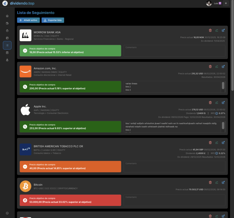 Quería anunciaros que hemos activado una licencia de por vida a un precio muy interesante (poco más que la suscripción anual) y que seguimos añadiendo funcionalidades a petición de nuestros usuarios: la última, añadir precio objetivo a las acciones en la lista de seguimiento, que ahora se muestra con colores intuitivos para que podáis saber de un vistazo lo cerca (o lejos) que está el precio actual del objetivo.