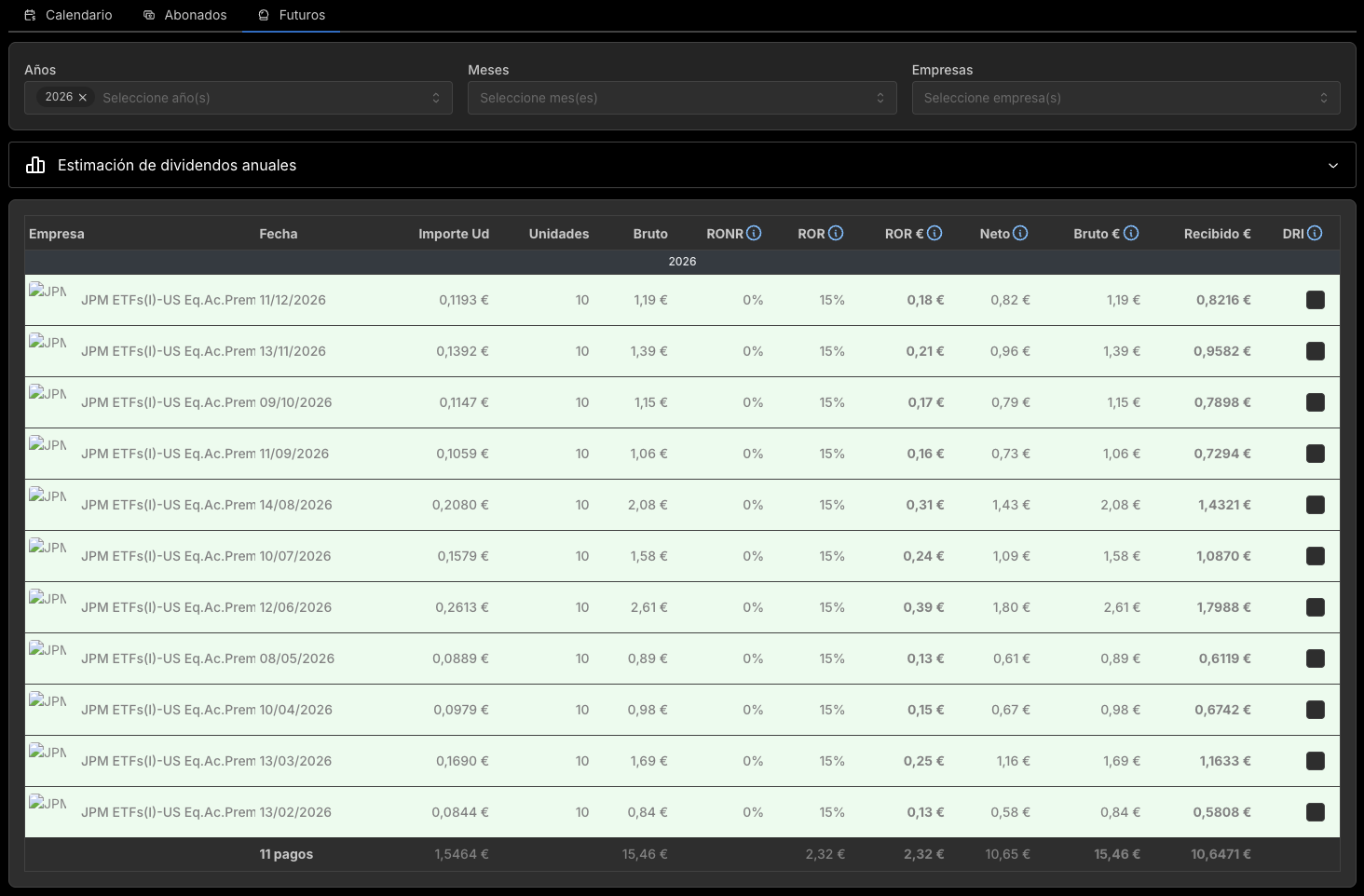 Gracias por tu sugerencia! lo que comentas tiene sentido por consistencia con los dividendos de empresas extranjeras, cuando es un dividendo esperado, pero creo que cuando hay un valor en el campo ‘Cantidad recibida en cuenta en €’ es más interesante mostrar ese dato en el calendario, porque es la cantidad que realmente ha llegado a tu cuenta y es más relevante que la cantidad bruta. No obstante, le puedo añadir el icono para mostrar también el bruto.