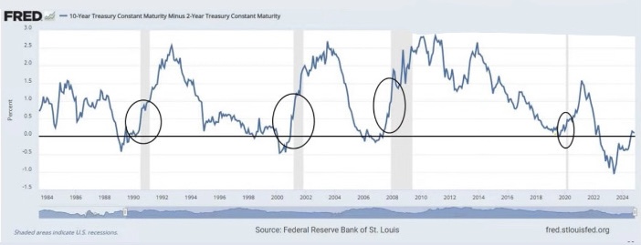 Alejandro Estebaranz comentaba ayer mismo que se acaba de desinvertir la curva de tipos del bono americano a largo y a corto plazo. En el pasado, no mucho después de darse esto, llegaba una recesión.