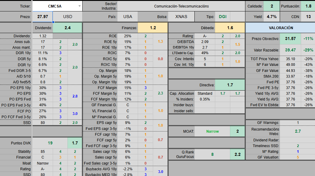 | 0P000001DB | XNAS:CMCSA | Comcast Corp | Communication Services | Telecom Services | 29.28 | 4.44% | Quarterly | 9.00% | 7.00% | 2 | A | 0.6064 | Narrow | Narrow | Standard | Medium | Medium | 49.00 | 0.60 | ★★★★★ | 16.0% | 24.0% | 20.0% | 30.0% |