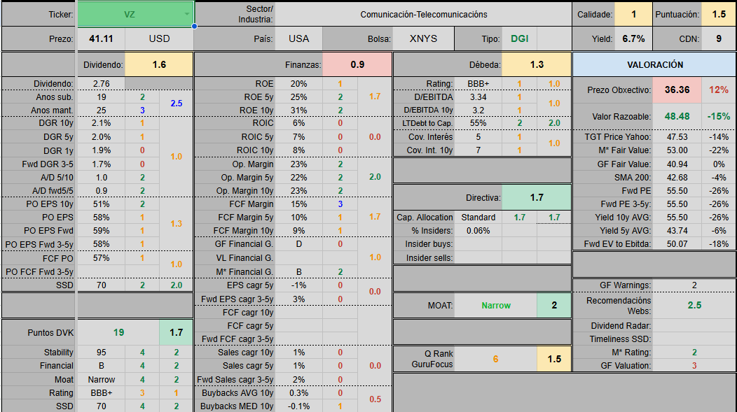 | 0P000005QY | XNYS:VZ | Verizon Communications Inc | Communication Services | Telecom Services | 38.82 | 7.01% | Quarterly | 2.00% | 2.50% | 1 | A | 0.6620 | Narrow | Narrow | Standard | Medium | Medium | 53.00 | 0.73 | ★★★★ | 13.0% | 17.0% | 15.0% | 15.0% |