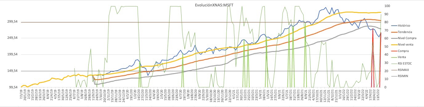 En este gráfico se ve la evolución de Microsoft. Las cuñas verticales en verde indican ventas, las rojas compra. La linea azul es la cotización a cierre semanal, la linea roja es la media de 40 semanas, la linea amarilla es el nivel de venta y la linea gris el nivel de compra. La linea fina verde es el RSI estocástico.