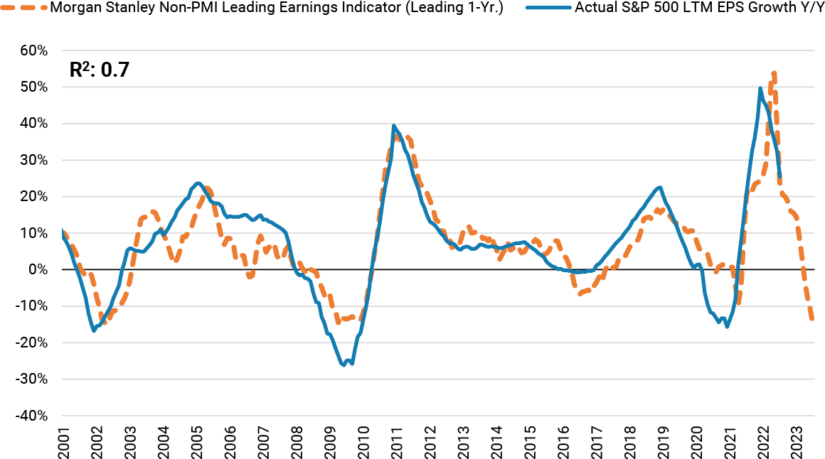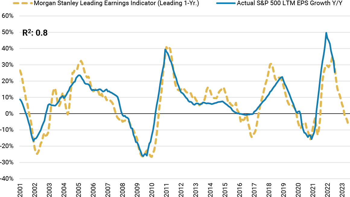 Morgan stanley tiene unos indicadores adelantados (N-1) sobre el crecimiento de los beneficios de las empresas del S&P y los EPS de las empresas siempre se han movido siguiendo las curvas de este indicador adelantado en el pasado.