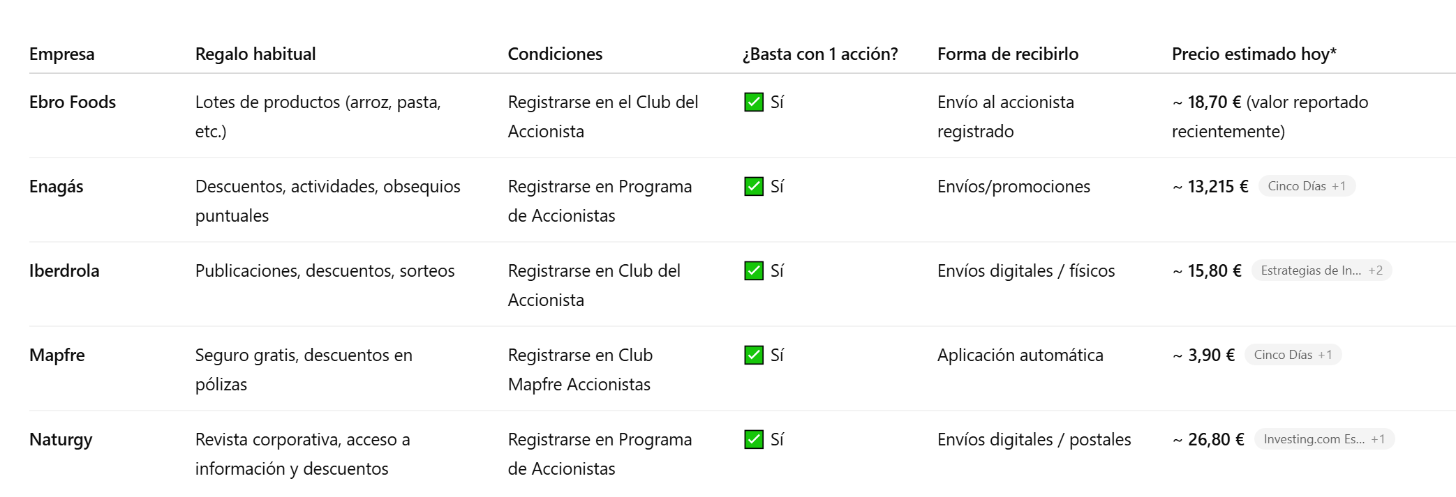 Así que me puesto a chatear con chati para ver que regalos se pueden conseguir con una acción y sin ir a la junta. El articulo al que se hace referencia aquí parece un poco antiguo y no está actualizado.