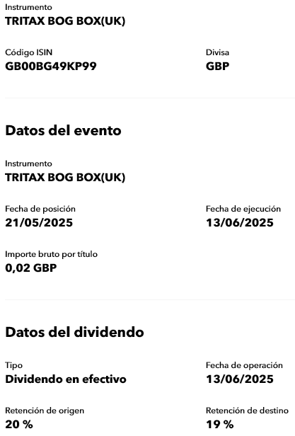 Hola a todos, es mi primera intervención en este foro, y quisiera consultar una duda. El día 13 de junio, la empresa Tritax Big Box, un REIT de Reino Unido en el que tengo una pequeña cantidad invertida, paga un dividendo de 0,02 libras.