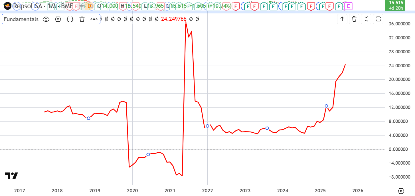 La tengo en 9,8, pero no me dio tiempo a formar una gran posición, por ello mi idea era usarla como trampolín de cara a una troncal de mi cartera, también me he planteado ponderar a la baja LYB, ya que la llevo a -40% con un único disparo antes de los famosos aranceles… Cierto es que hay un programa de recompras en REP hasta diciembre, quizás mejor esperar.
