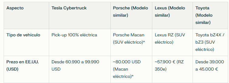 He puesto el cybertruck, porque es de lo que se hablaba. La comparación es la que hace la IA, yo le pedí que me hiciese comparativa con un modelo similar de cada marca.
