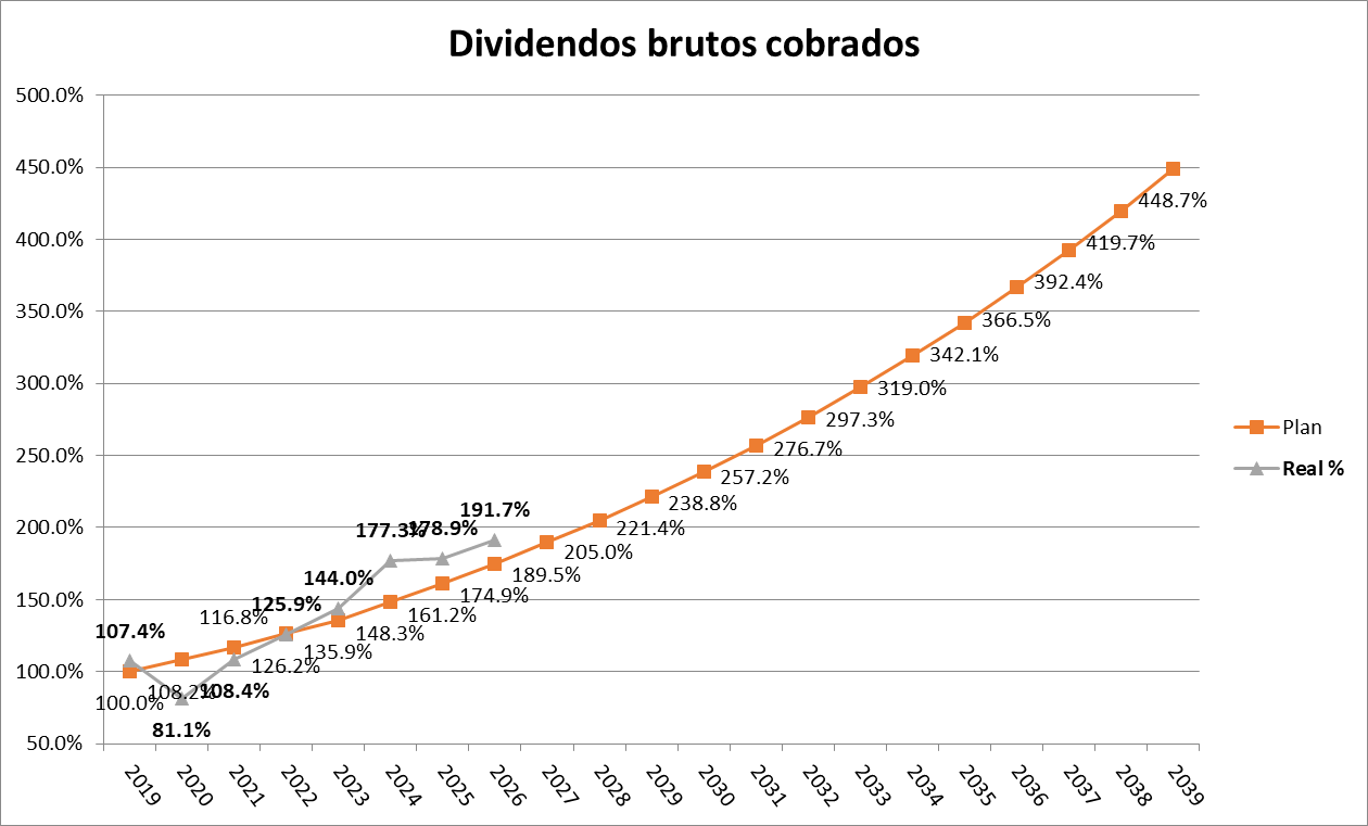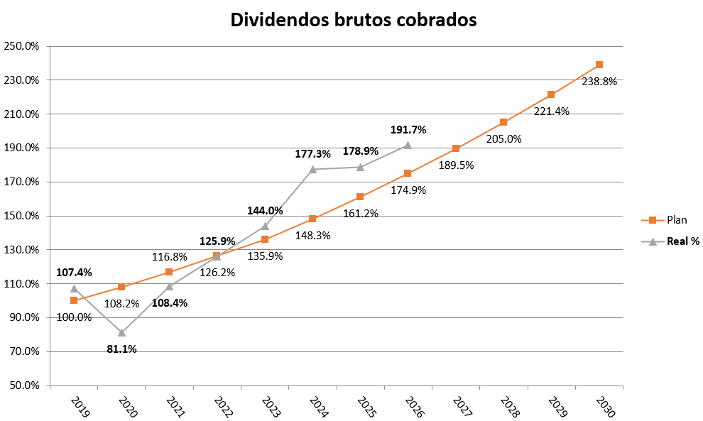 Para finalizar, comparto la evolución de los dividendos cobrados en los últimos años comparado con el plan: