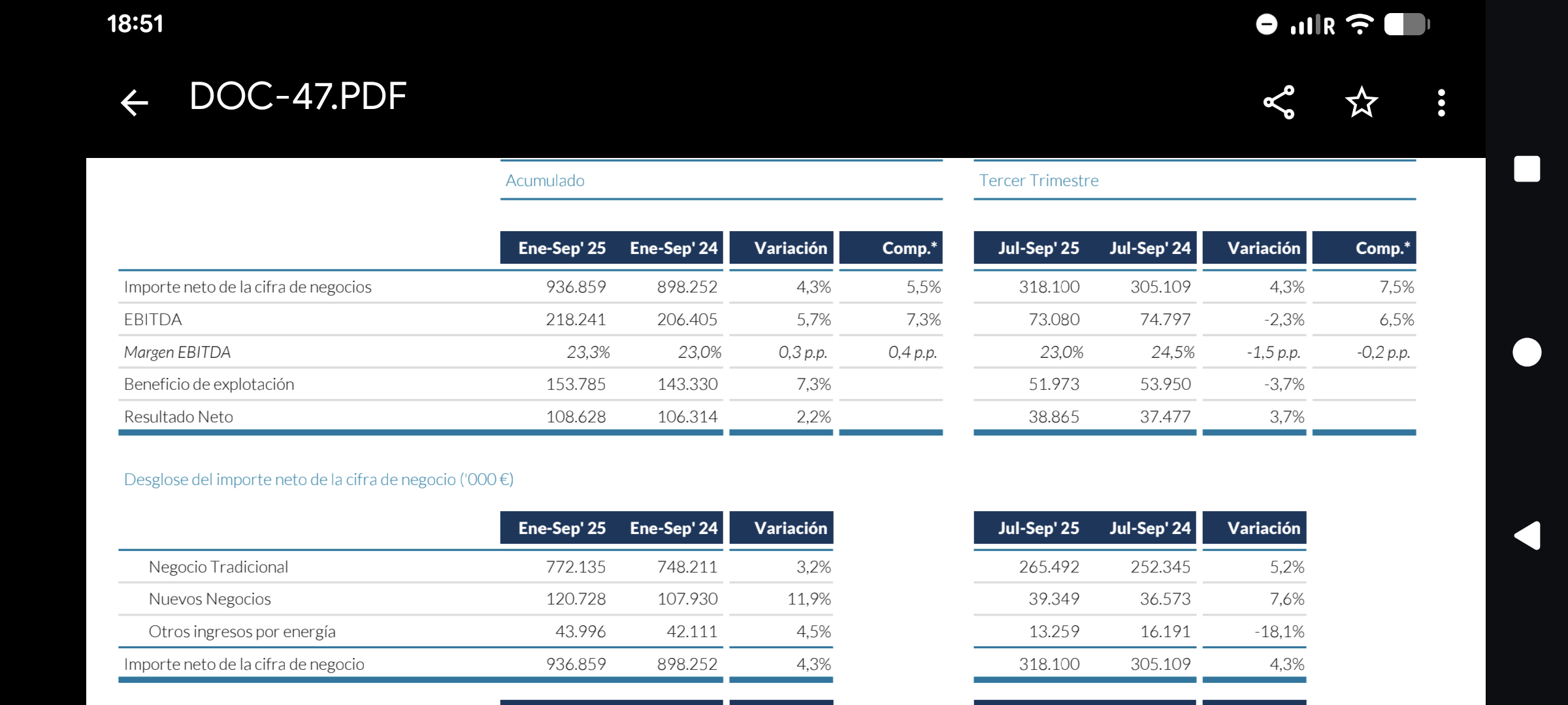 El resultado bruto de explotación (ebitda) también ha ascendido hasta septiembre, al alcanzar los 218,2 millones, un 5,7 % más, mientras que en el tercer trimestre logró 73,1 millones.